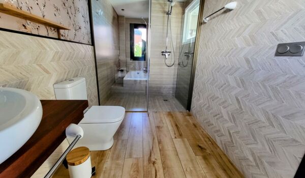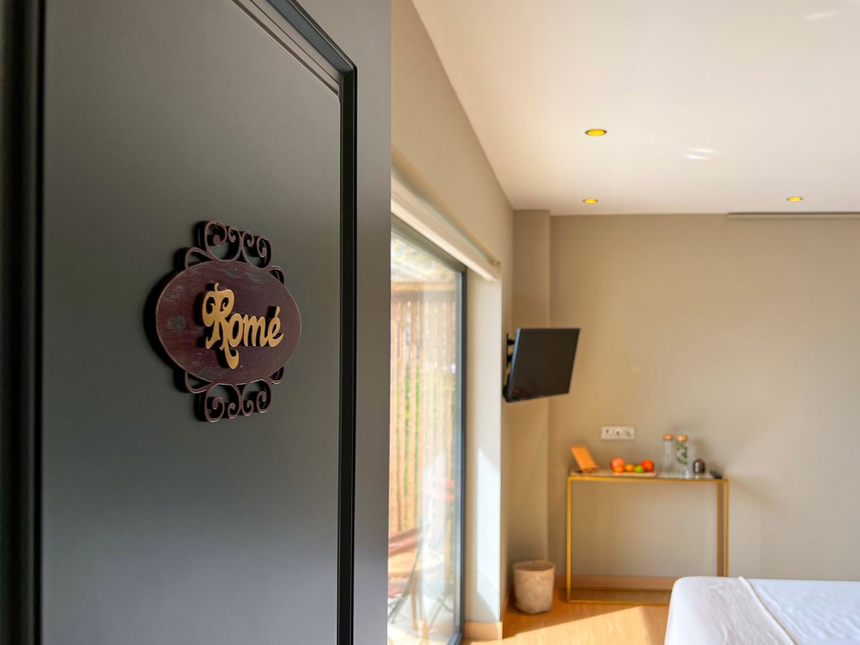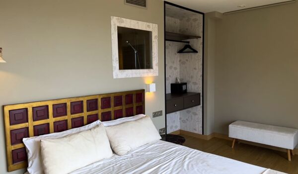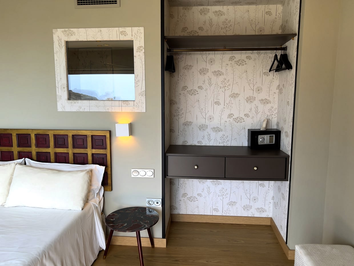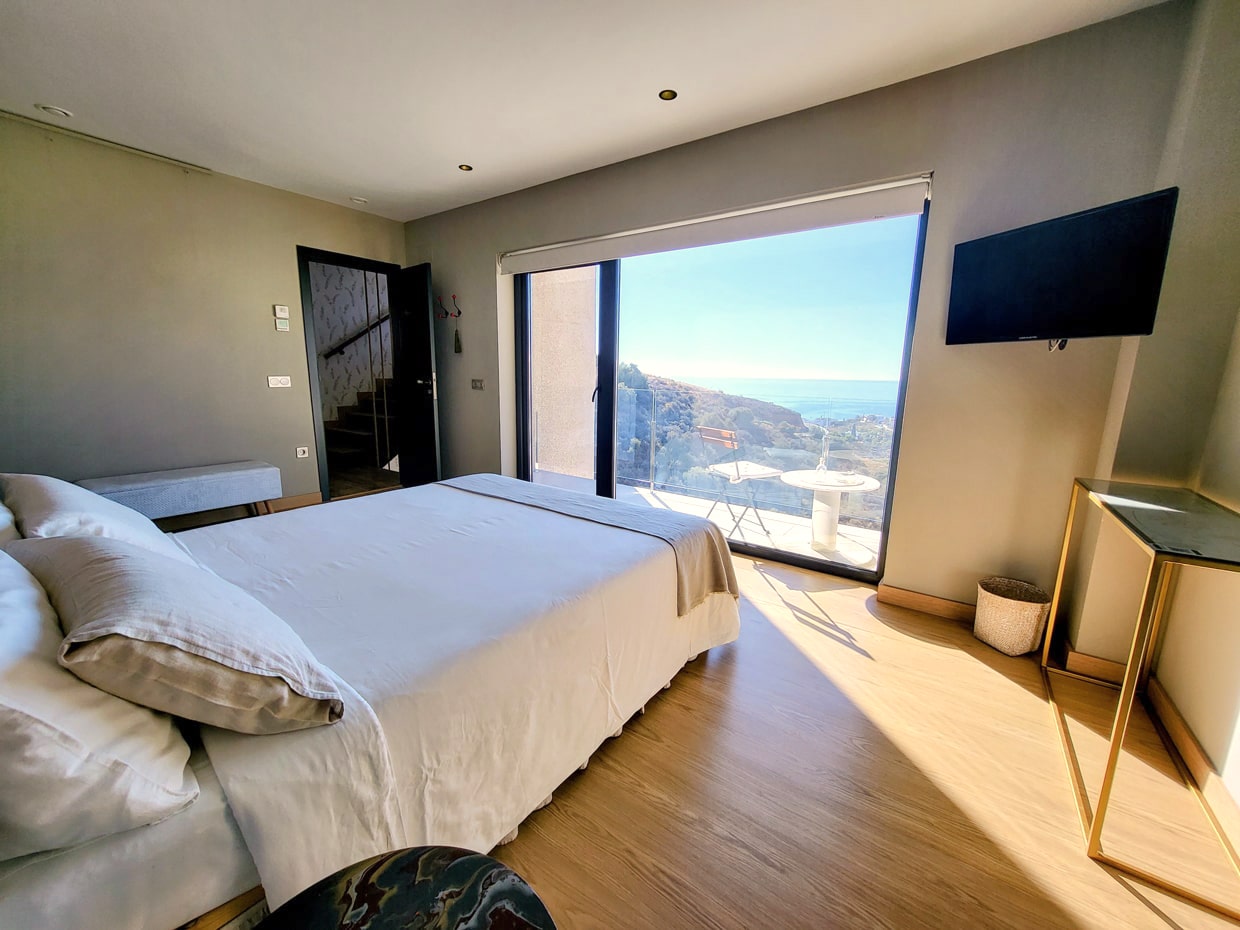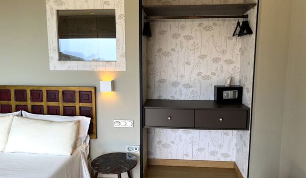 The Deluxe room is 25 m2 and has a small terrace. The room has a private bathroom, a shower with sea view and a bathtub overlooking the vertical garden. A kitchen and a lounge can be used communally with other visitors. Enjoy the intense blue color of the Mediterranean Sea.